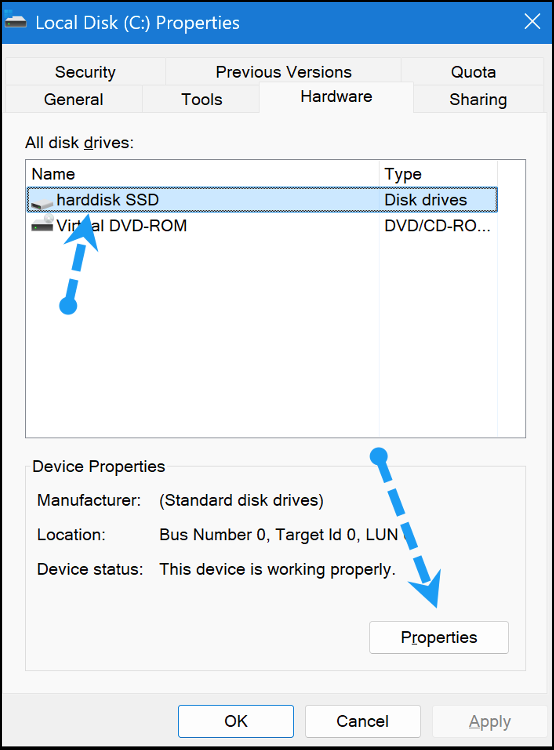 3) Click the hard drive and then click the Properties button in the bottom right of the screen to open the following window.