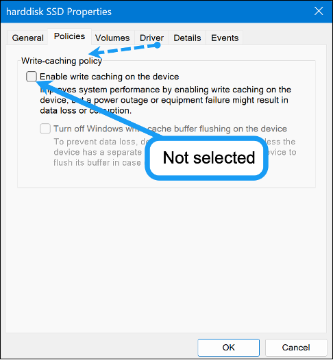 5) Ensure that the "Enable write caching on the device" checkbox is NOT selected. Click OK to complete the changes.
