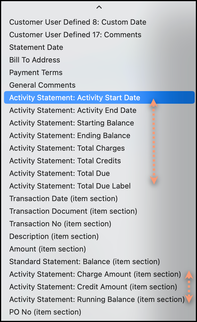 NOTE: There are specific fields that are only applicable to certain a certain type of statement. All fields that begin with Activity Statement can only be used on that type of report. See below for list shown by orange arrows.