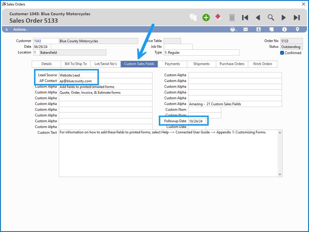 The following is an example of how Custom Sales Fields appear in the Sales Order window.