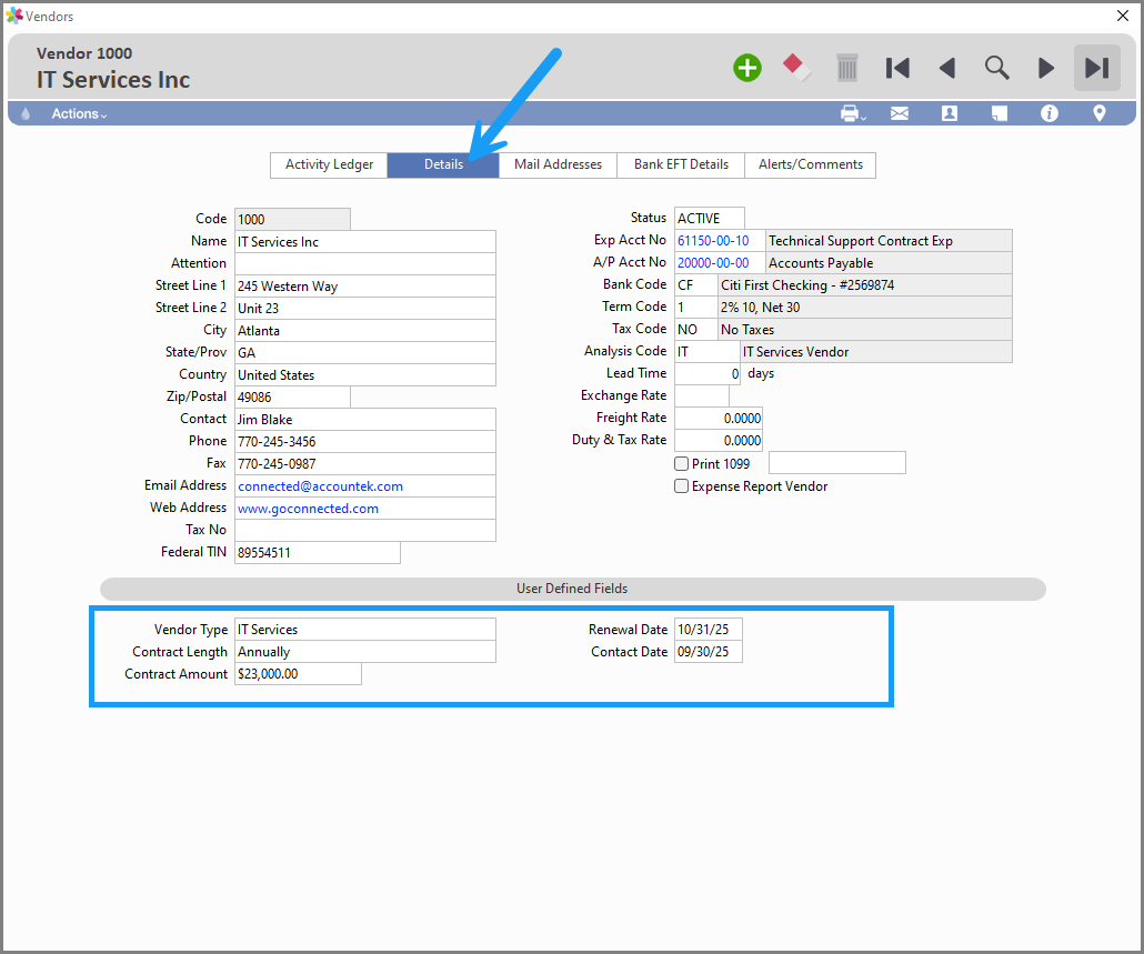 A great example of how to use these is for tracking contracts with Vendors. This screen shows the location of the custom fields in the Vendors window. If a lower screen resolution is used, the fields will appear under separate tab.