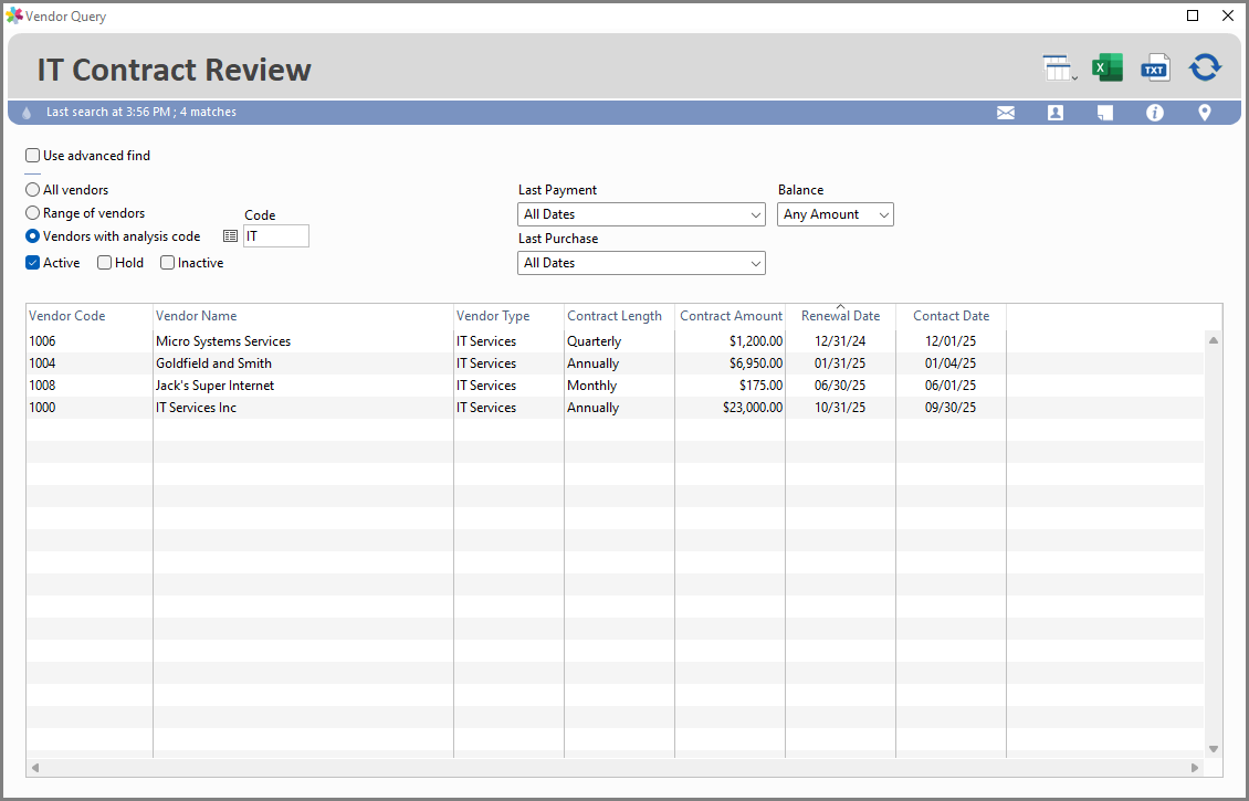 Using the Vendor Query Window and a saved Connected View, it is easy to keep an eye on contracts and due dates, as shown below.