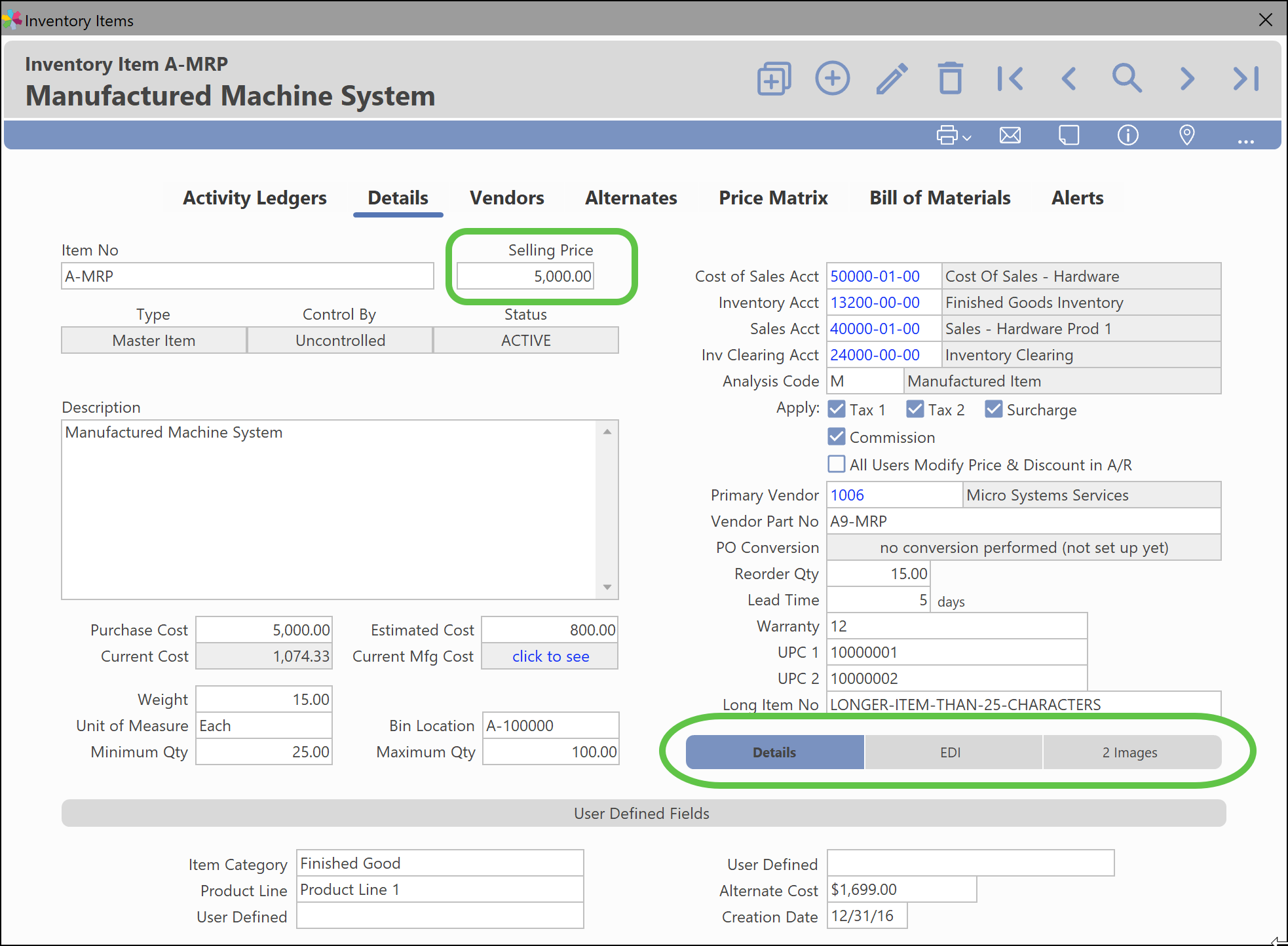 To help facilitate the Item No field being lengthened, the Details tab of the Inventory Item window has a new layout applied. Fields like "Selling Price" have been made more prominent and in a more logical tab order. Additionally, less used tabs like "EDI" and "Images" are nested in the bottom right. An example of the new window layout is shown in the following screen:
