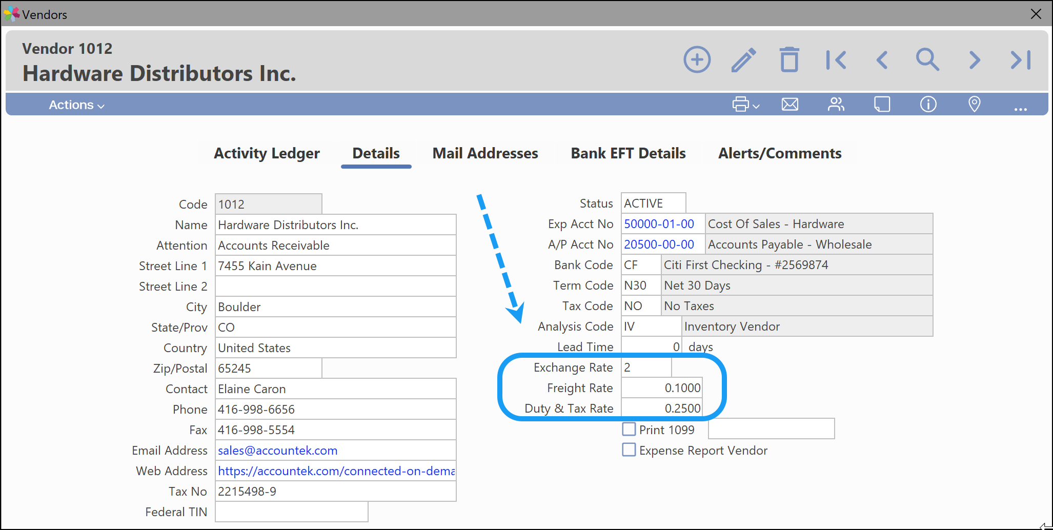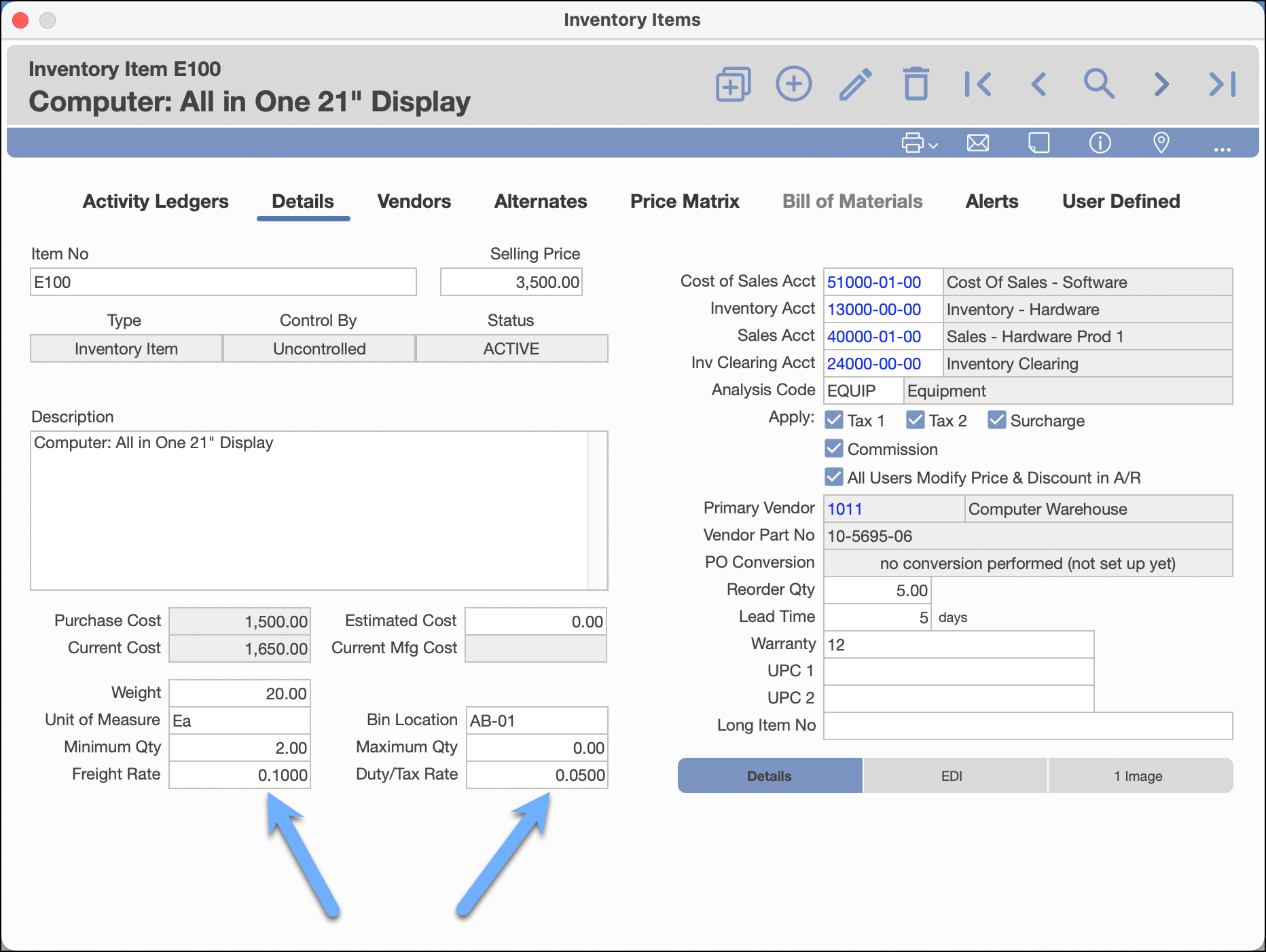 Each vendor can be assigned a Freight Rate and a Duty & Tax Rate percentage. This makes the cost factors more precise, especially if you have vendors in various countries, as freight charges can vary depending on the country of origin.