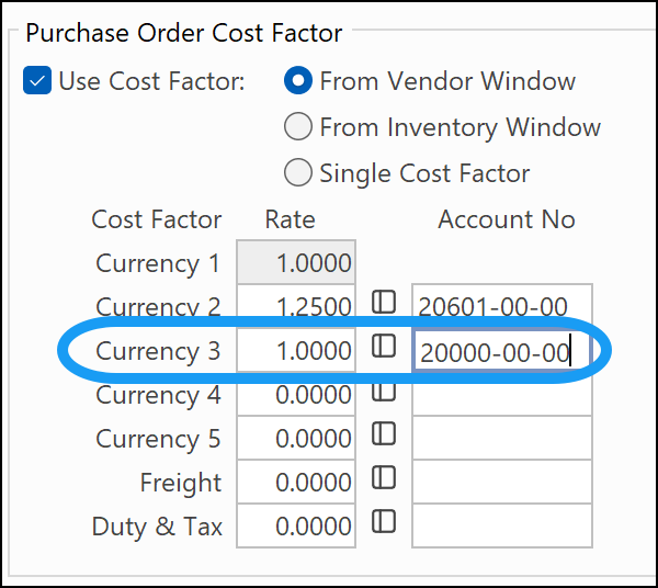 Note: The "Exchange Rate" is always active in the Vendors window, once the Cost Factor is enabled.