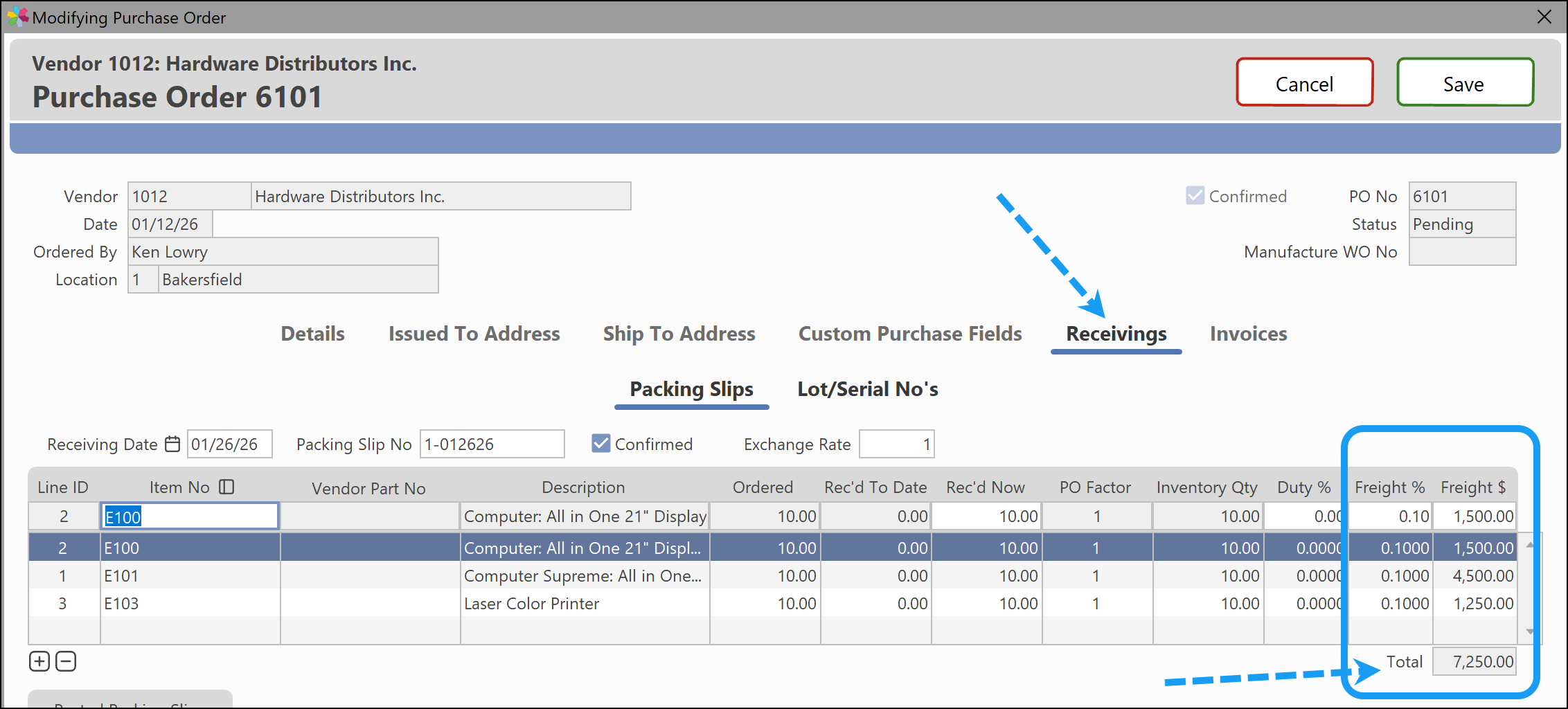 The converted Freight $ from these factors will appear to the right of the factor as shown with a total of the Freight amount to be applied to the purchase order receiving.