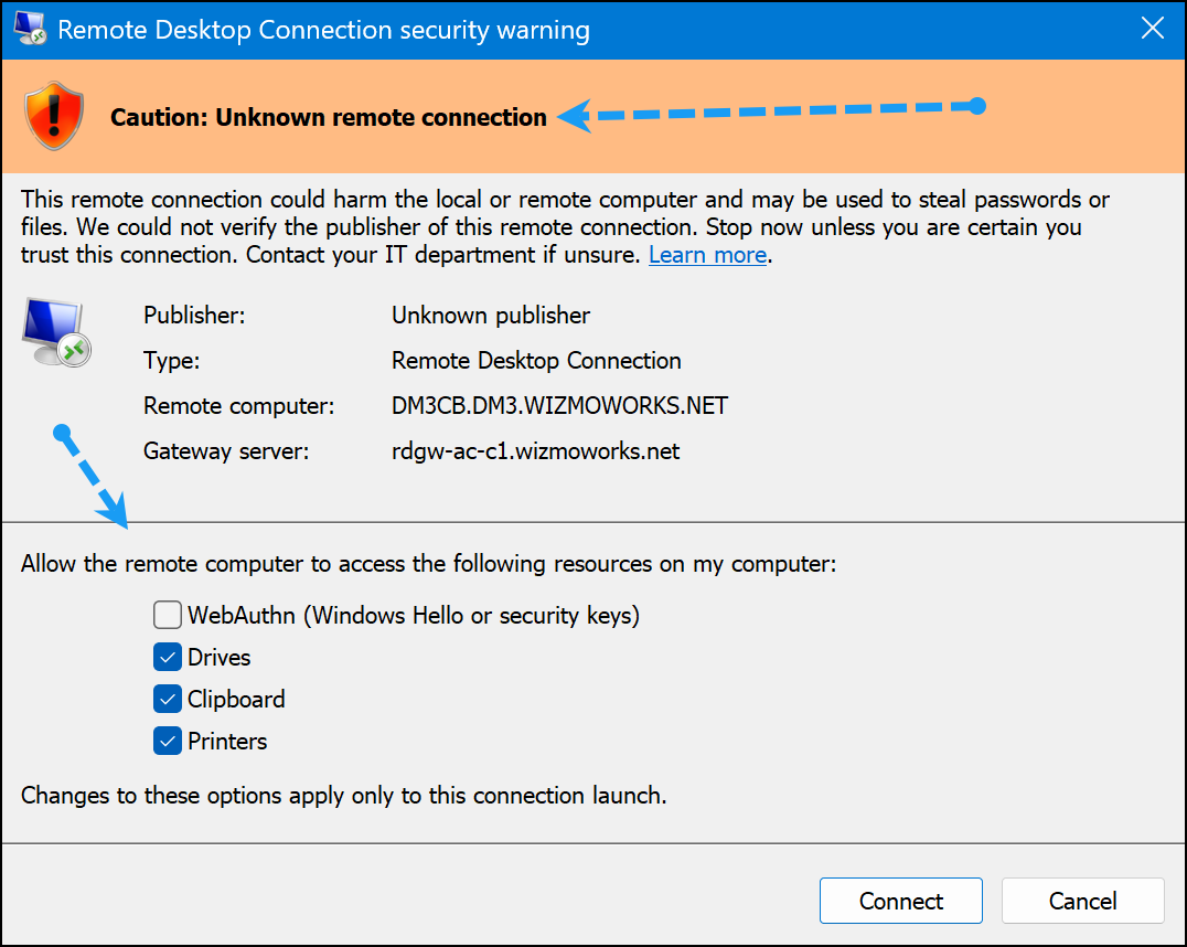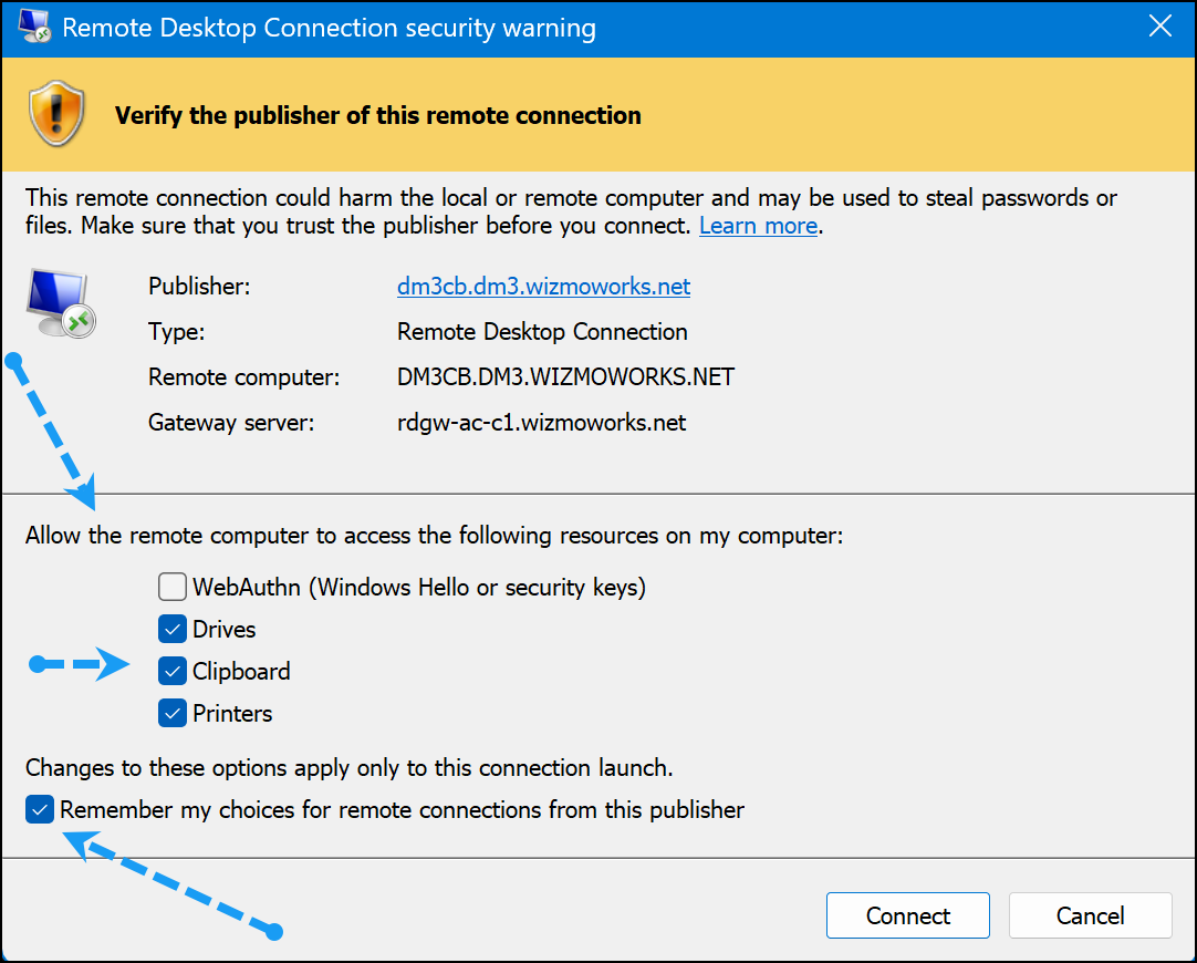 When launching access to Connected on Demand, the following Remote Desktop Warning window may appear. As per the screenshot below, select the applicable resource choices AND the "Remember my choices for remote connections from this publisher" checkboxes.